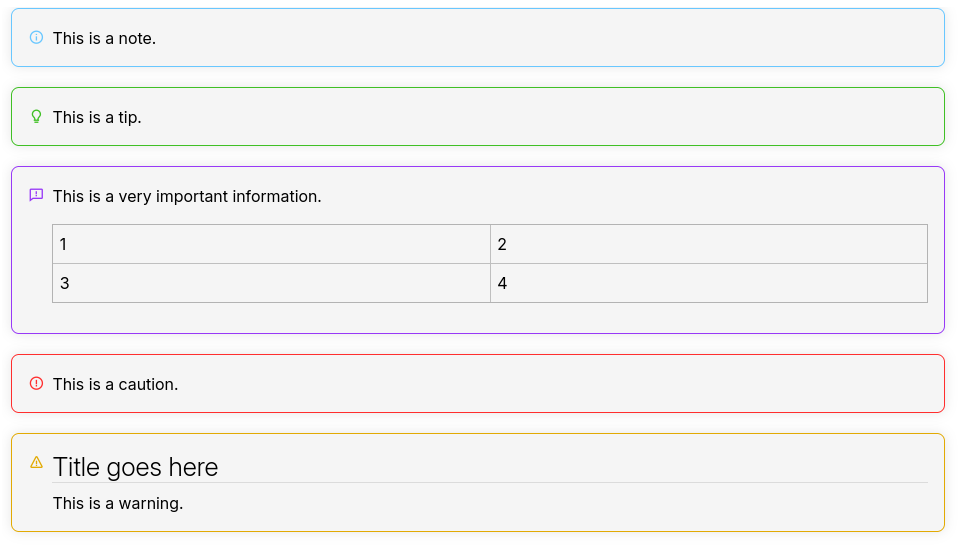 从功能的角度来看,告诫的作用与块引用非常相似,只是样式不同。这包括在其中插入其他元素的能力,例如标题、表格、图像等。