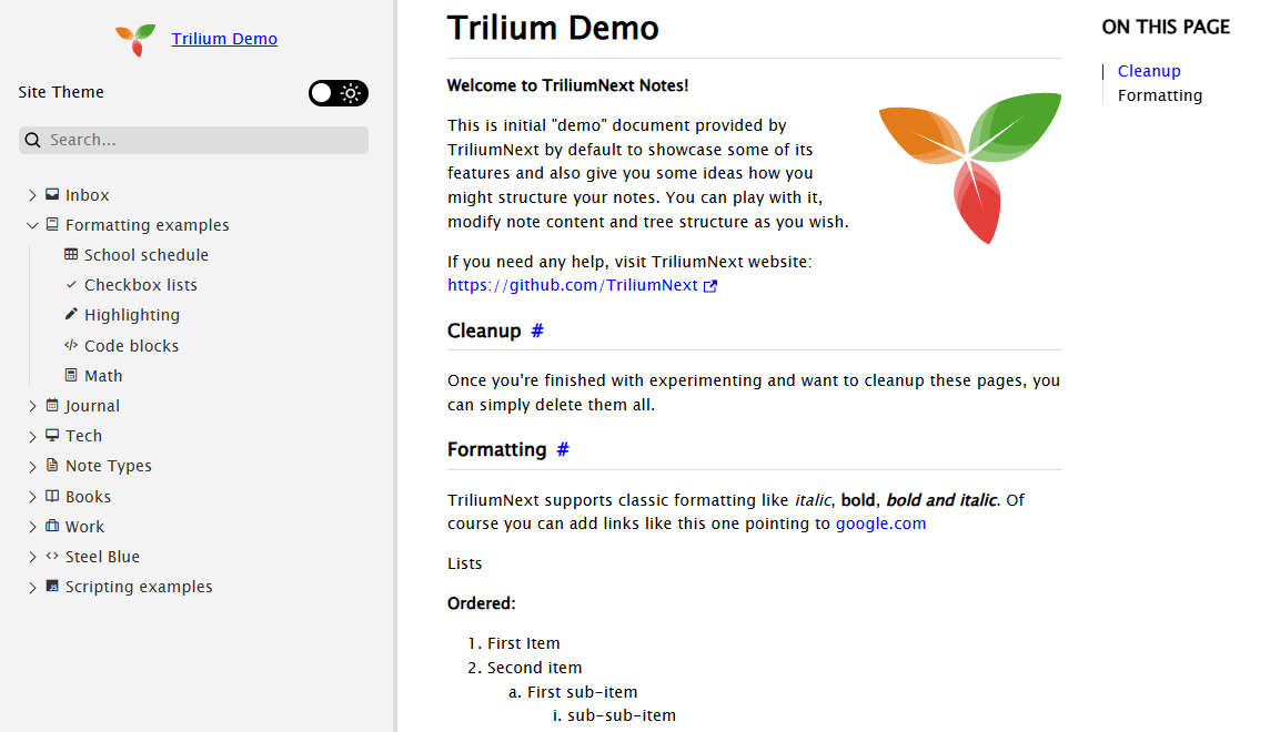 Trilium 允许您将选定的笔记共享为可公开访问的只读文档。此功能对于直接从 Trilium 笔记中发布内容特别有用,使其他人可以在线访问。