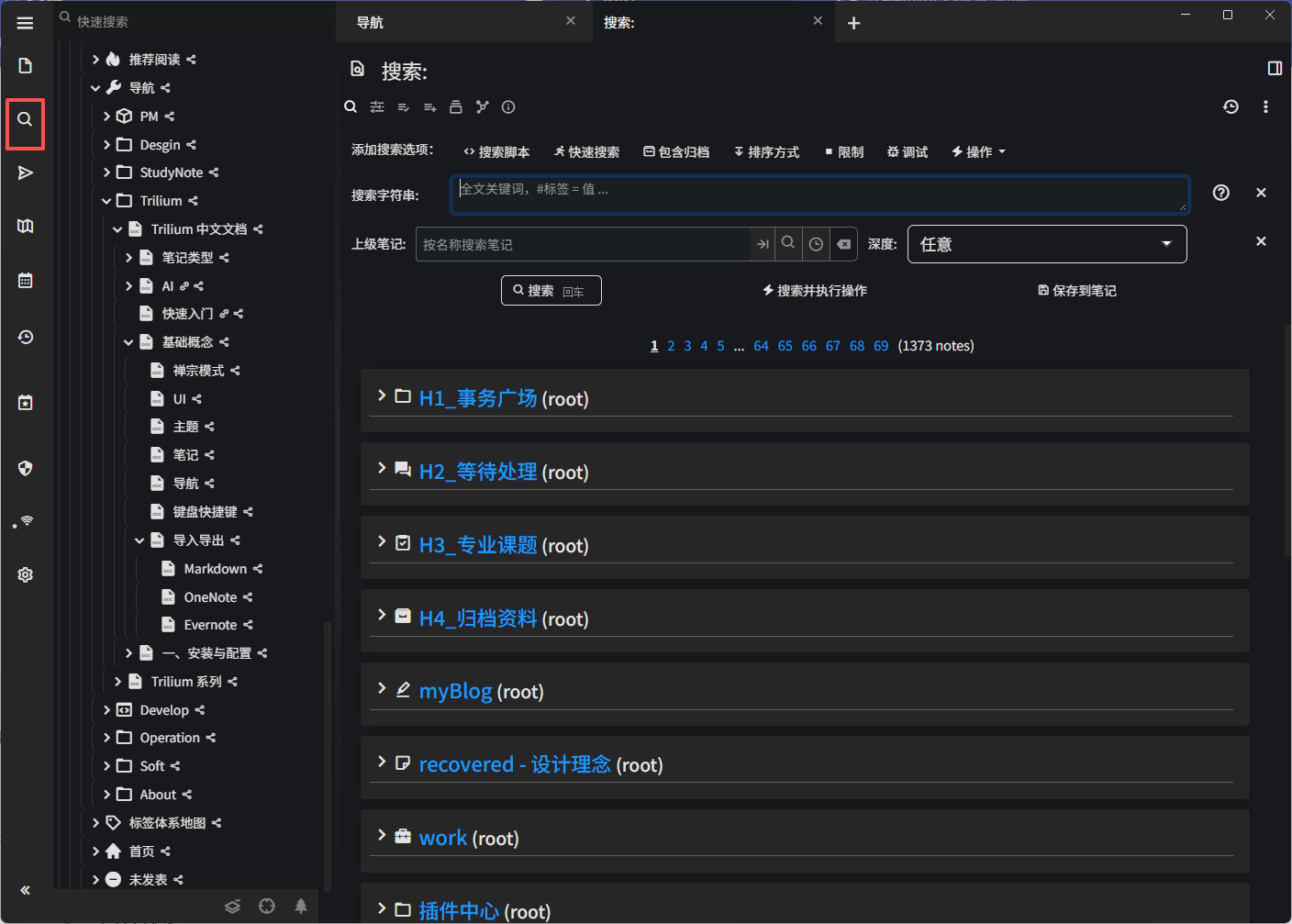 通过笔记搜索,您可以通过搜索笔记标题、内容或属性中的文本来查找笔记。您还可以选择保存搜索,这将创建一个特殊的搜索笔记,该笔记在您的导航树上可见,并将搜索结果作为子项包含在内。