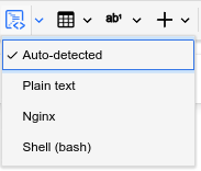 。直接按下图标将插入一个代码块,其中包含最近选择的语言。如果这是第一次插入代码块,则默认情况下该语言将处于“自动检测”状态。