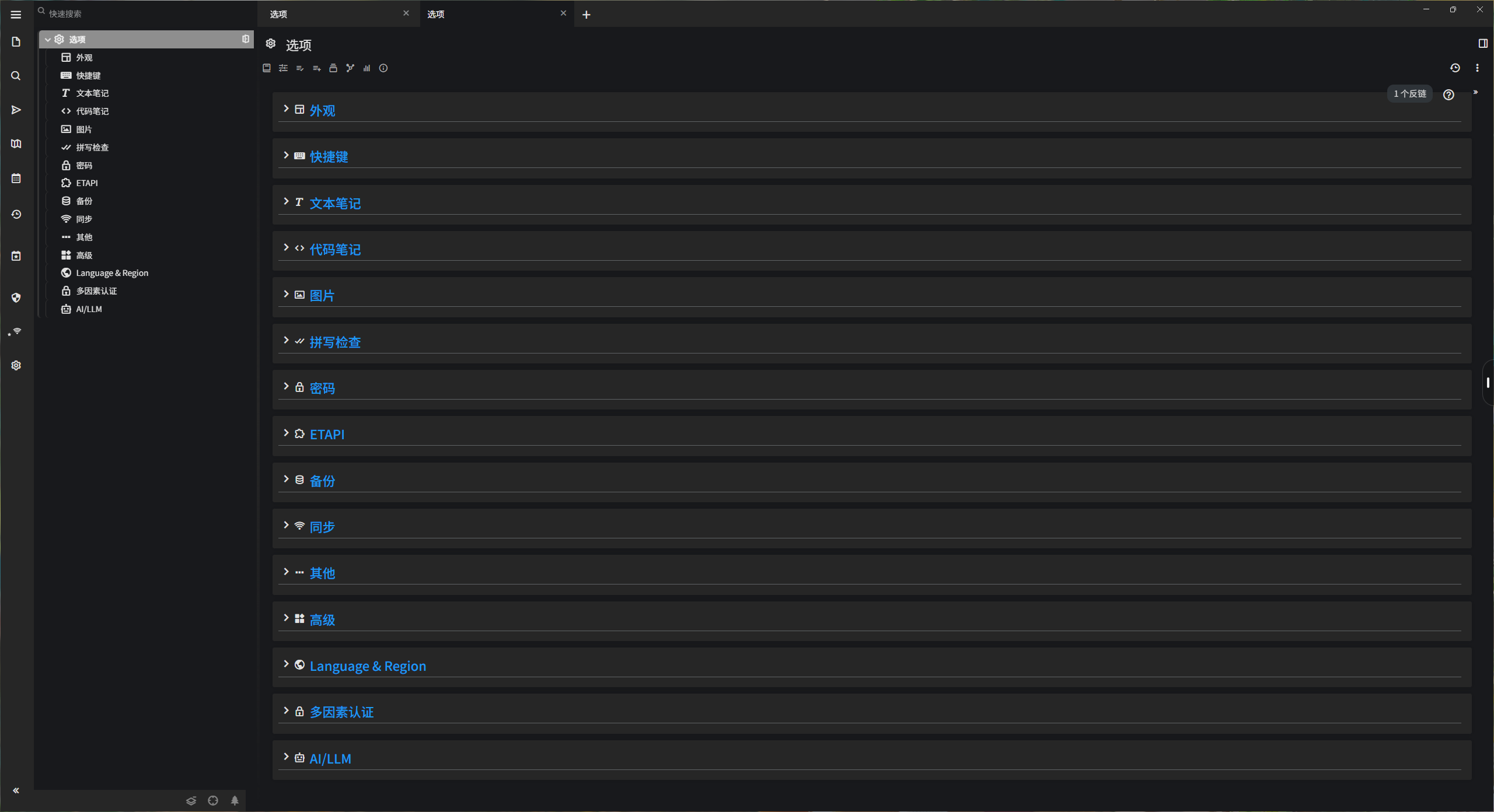 选项部分允许配置 TriliumNext 客户端和服务器。