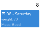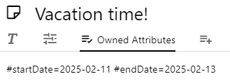 #calendar:displayedAttributes | 允许在日历中显示一个或多个属性的值,如下所示:![]() 它也可以与关系一起使用,在这种情况下,它将显示目标注释的标题: #weight="70" #Mood="Good" #calendar:displayedAttributes="weight,Mood"~assignee=@My assignee #calendar:displayedAttributes="assignee" |