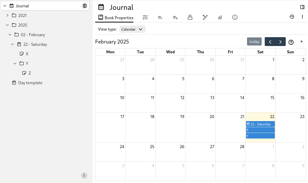 可以将日历视图集成到带有日期注释的日记帐中。为此,请将日记帐笔记(日历根)的注释类型更改为集合,然后选择日历视图。