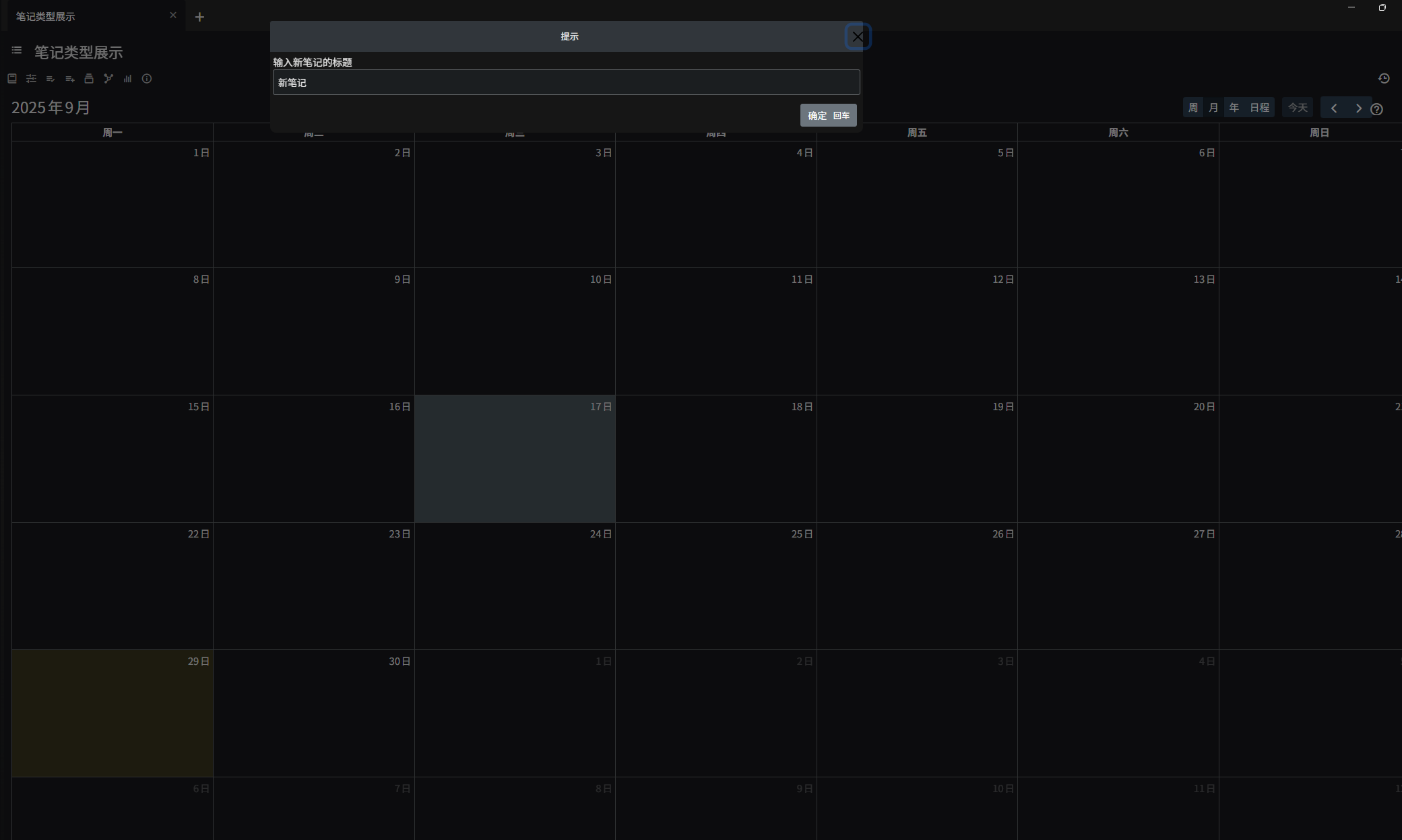 日历模式可以按照不同周、月、年的视图展示,可以点击具体日期直接创建笔记到具体的日期视图。也可以用做日历、日程使用。