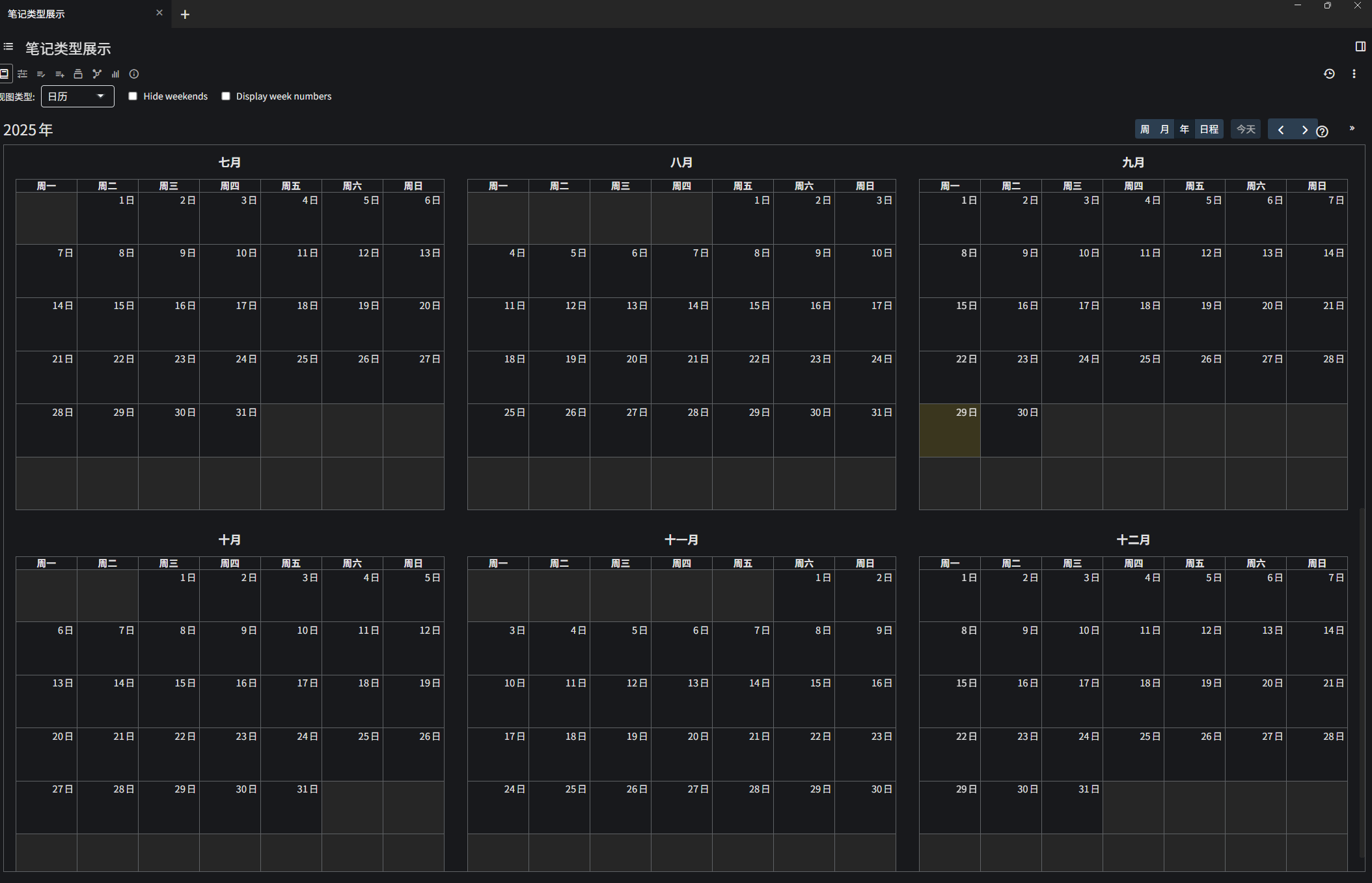 当不在日记帐中使用时,日历是递归的。也就是说,它不仅会在其子笔记中查找事件,还会在这些子笔记的子笔记中查找事件。