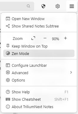 除了全局菜单之外,还可以使用键盘快捷键激活此模式(自 TriliumNext 0.92.5 和 + 以来,旧版本也是如此)。在快捷方式配置中查找。F9 Alt Z toggleZenMode