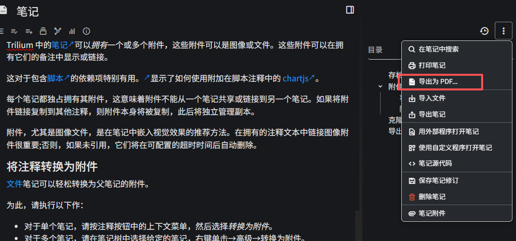 在 Trilium 的桌面应用程序上,可以将笔记导出为 PDF。在服务器或 PWA(移动)上,由于技术限制,该选项不可用,并且将被隐藏。