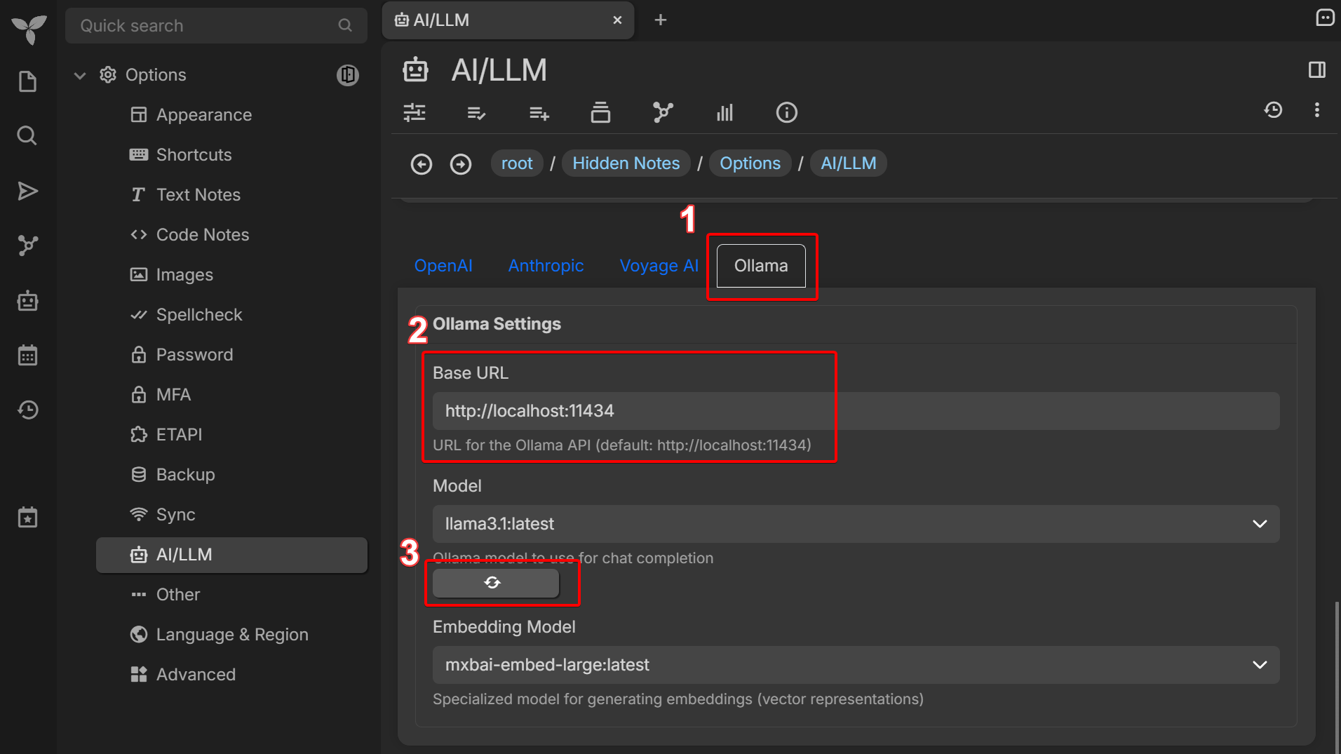 首先,我们需要从提供商选项卡中选择 Ollama 提供商,然后我们将输入 Ollama 的基本 URL。由于我们的 Ollama 在本地计算机上运行,因此我们的基本 URL 是 。然后,我们将点击“刷新”按钮,让它获取我们的模型:http://localhost:11434